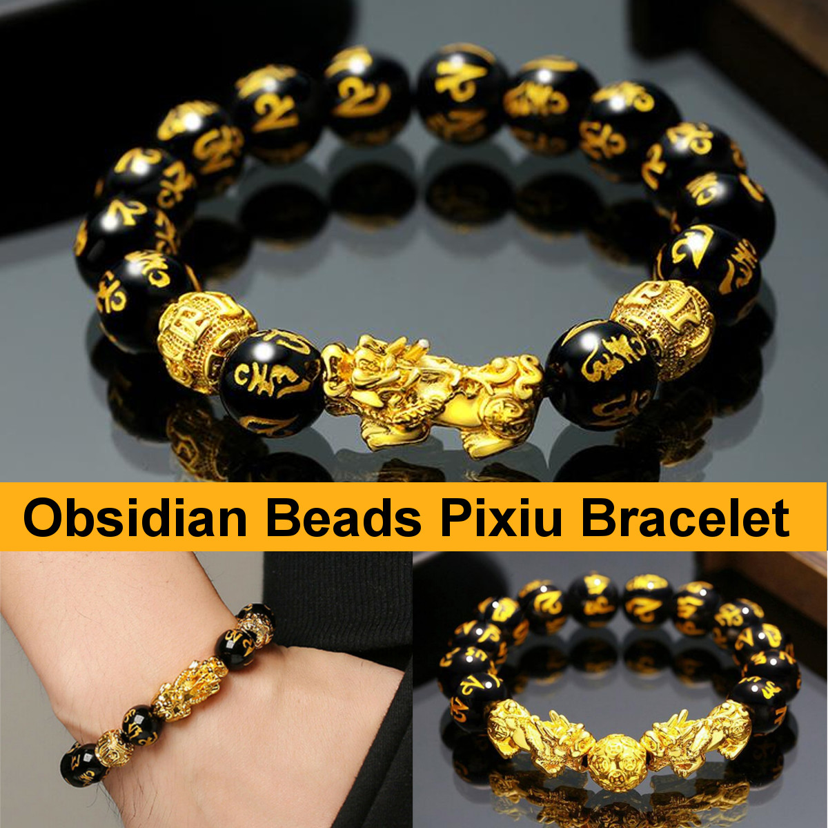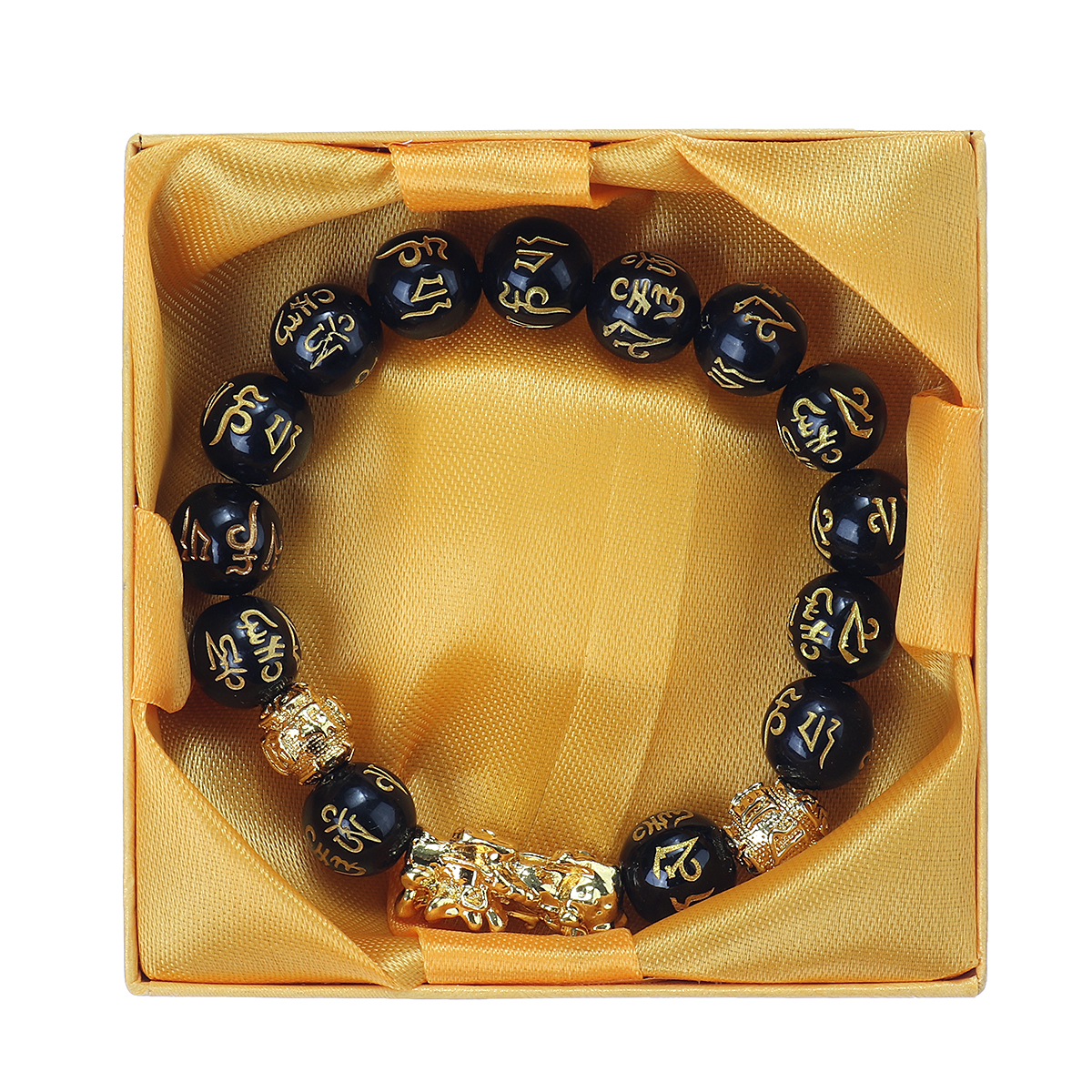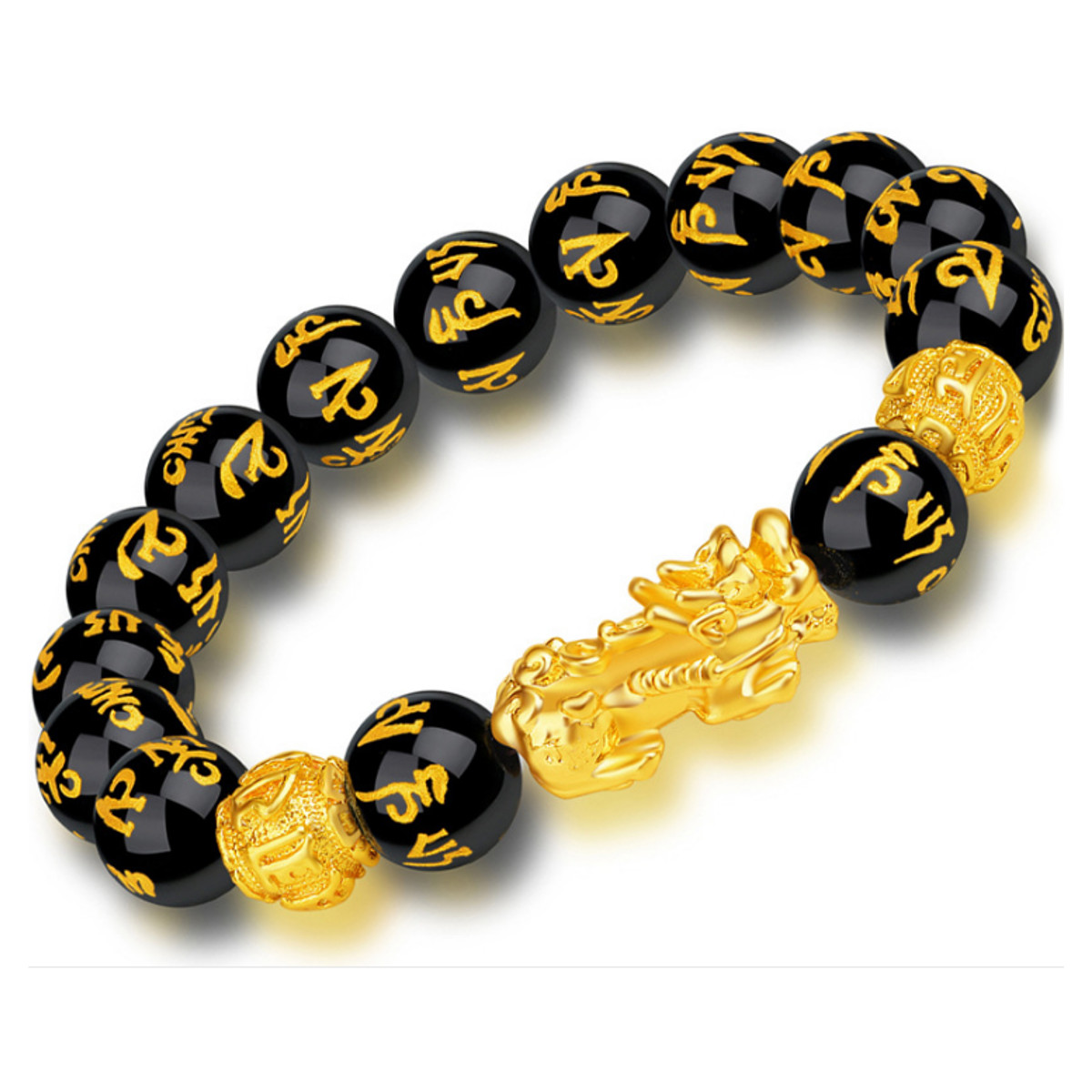 Buddhist Mantra Prayer Beads Pixiu Six Gold Word Bracelet Feng Shui Luck Obsidian Bangle