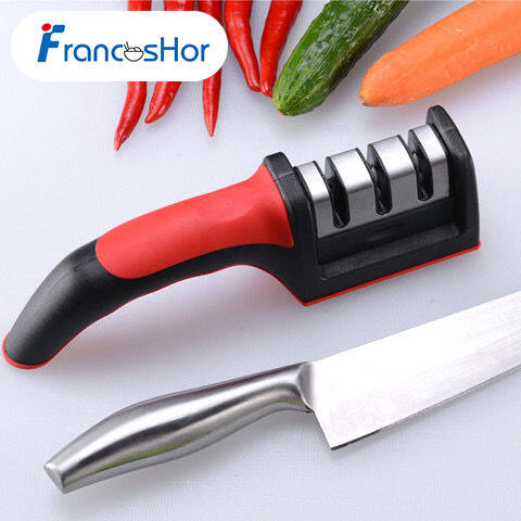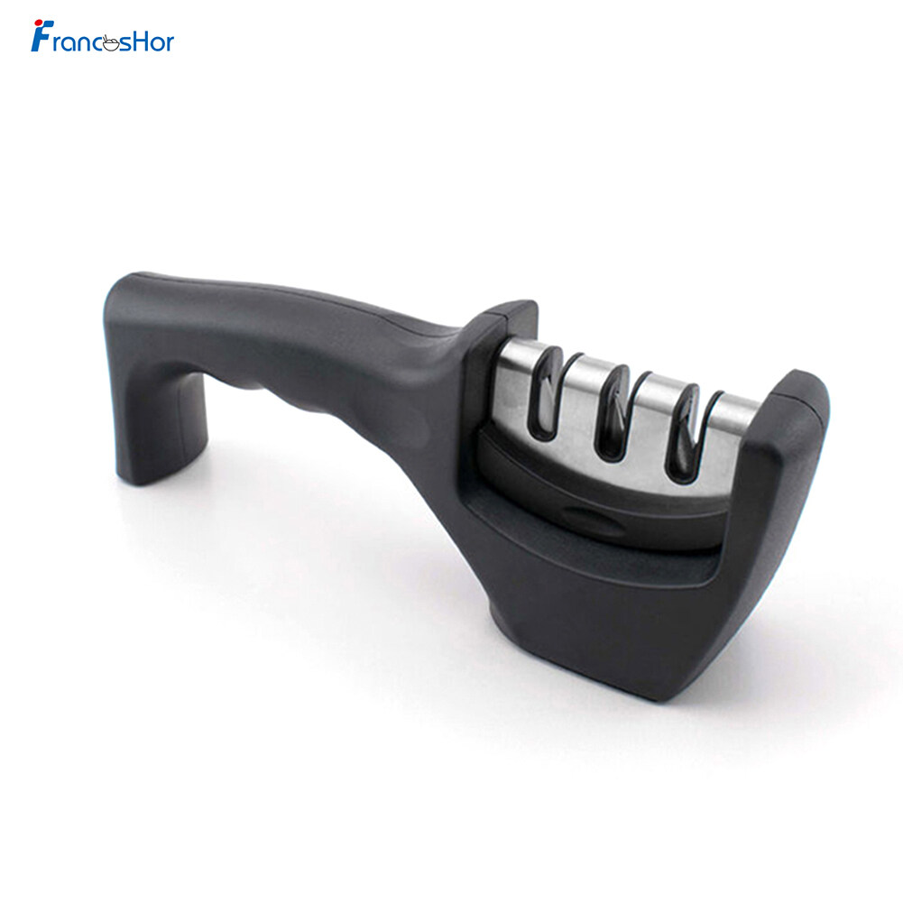 3 STAGE MANUAL SHARPENER - for Brilliant Results every time. Prepare, Sharpen, then Hone. Quickly and effectively keeps your kitchen knives brilliantly sharps and restores blunt knives back to their former sharpness.ERGONOMIC DESIGN - the Sharpener features a comfort handle for maximum grip, suitable for both right and left-handed users. Heavy duty non-slip rubber base for stability & safety - any flat surface in your kitchen will do (no need to find a suitable clean surface, unlike sharpeners with suction cup designs).FOR USE ON: straight edged steel kitchen knives and wide serrated knives (bread knives), including knives with hardened steel blades. DO NOT USE ON: ceramic knives, scissors or micro serrated knives.