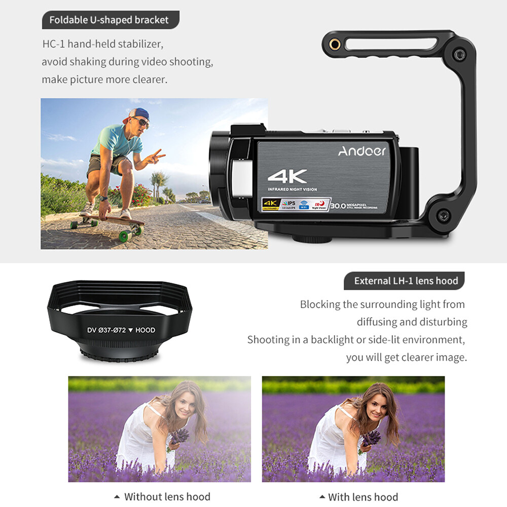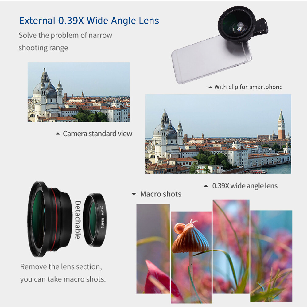 Comes with one 0.39X super wide angle lens and a lens hood to widen the shooting angles, can be used as macro lens after the wide-angle lens being disassembled, with a clip for mounting the lens with smartphones; One external microphone for better radio effect while recording in outdoor activities, conference, etc. and a camera holder for more stable video recording.