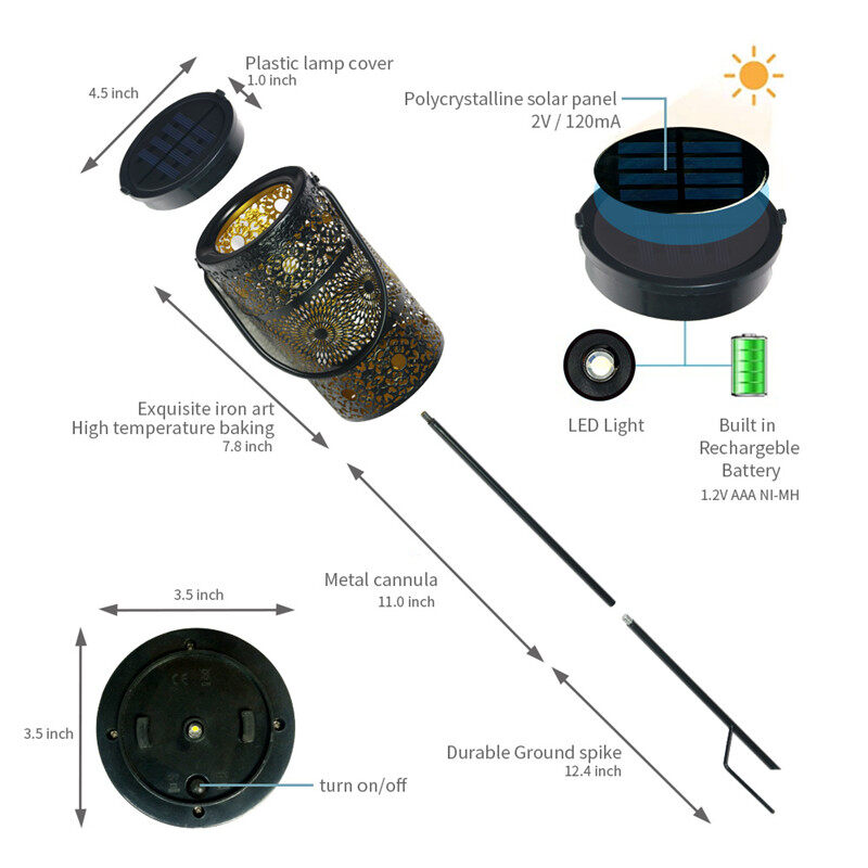 • 【SOLAR POWERED】The lanterns automatically turn the lights on at dusk and off at dawn, saves energy. There is the switch ON/OFF on the lantern cover, make sure the button is in the “ON” position before changing it in the sun. Each lantern includes 1pc AA 200mAh NI-MH battery, when getting enough sunlight, the lantern will be turned on automatically and can last for 8 hours or more at night.