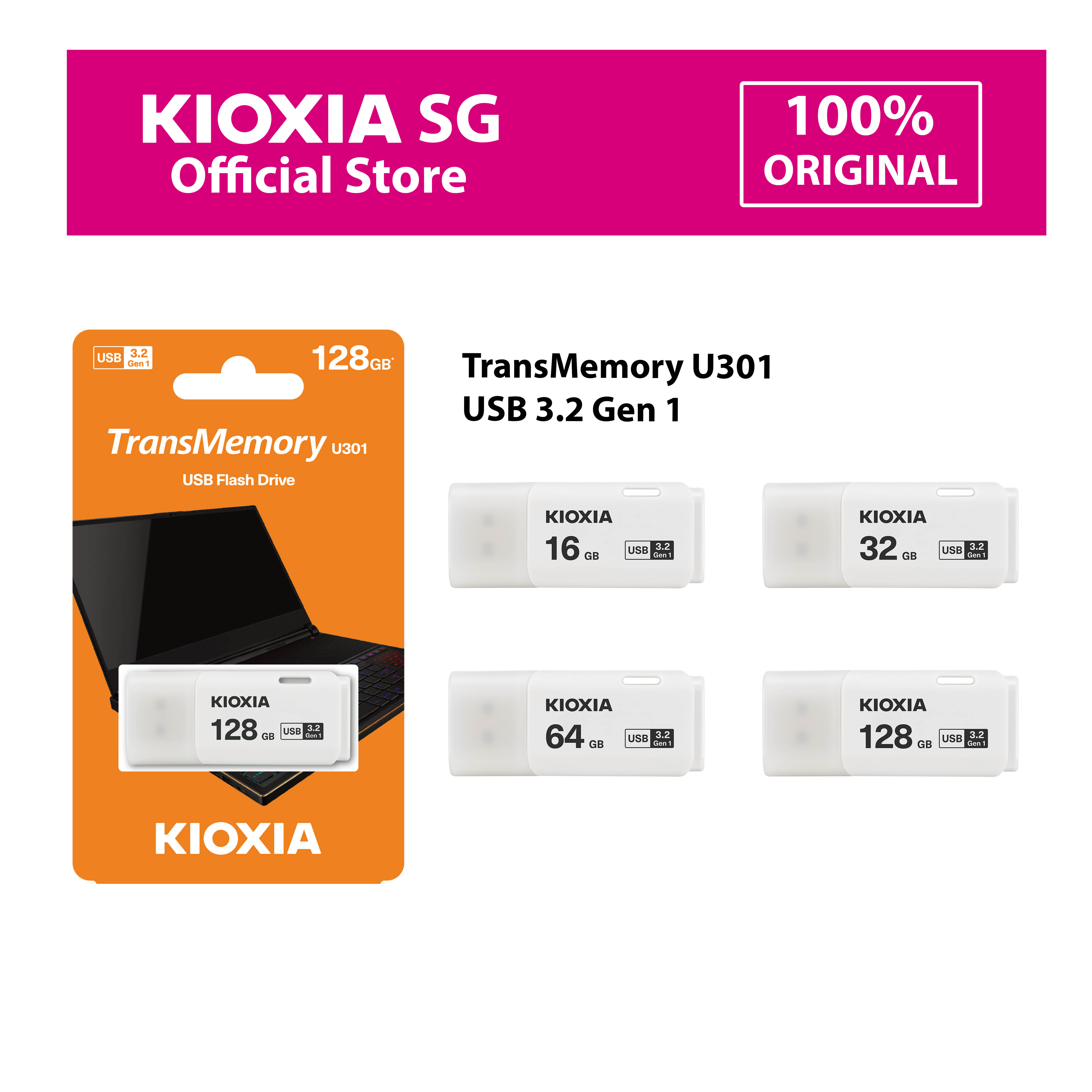 KIOXIA TransMemory U301 USB flash drives make it simple to store your media – with a design that’s small in size, but big on storage, and features USB 3.2 Gen 1 technology. With a range of capacities up to 128GB, you can organize more of your documents and media across various devices.