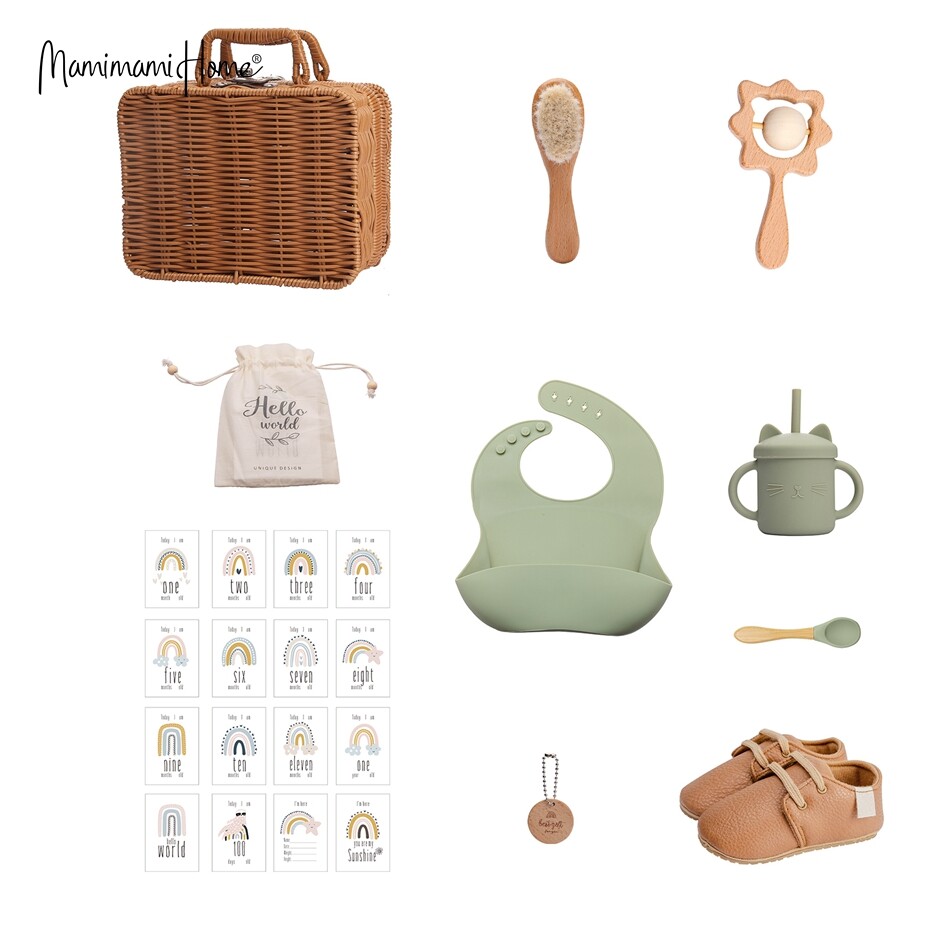 1 x Silicone Bib,1 x Silicone Spoon,1 x Sippy Cup,1 x Wooden Brush,1 x Wooden Rattle,1 x Baby Shoes,16 x Milestone Cards,1 x Rattan Box