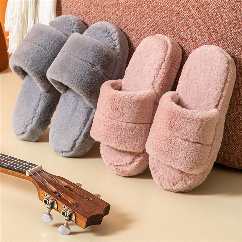 Features:Home Slippers Solid Color Winter Plush Warm Flat Home Shoes Soft Shoes Open Toe Indoor Slippers