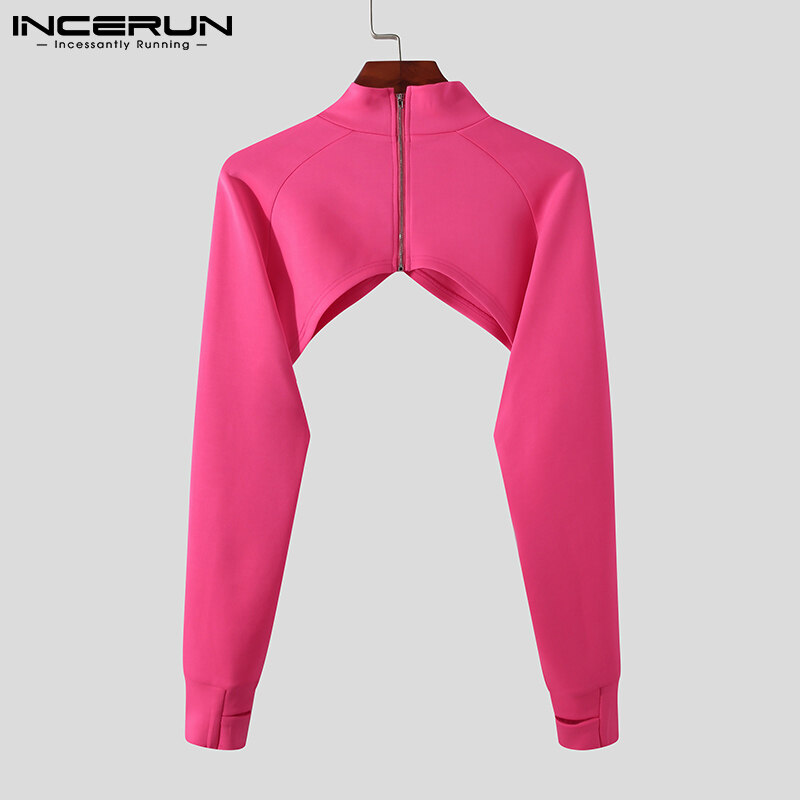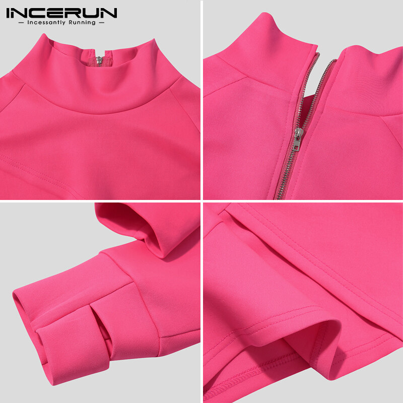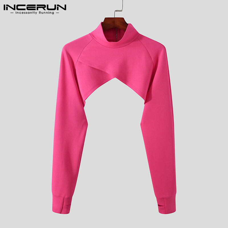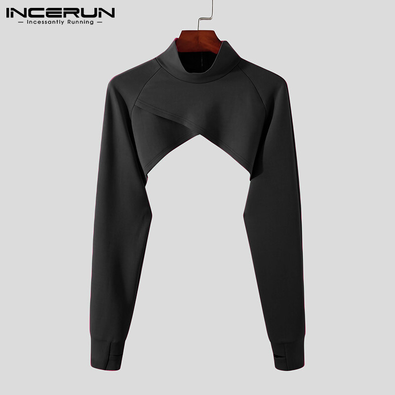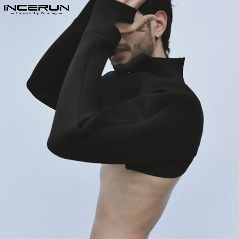 INCERUN Men Long Sleeve High Neck T Shirt Backless Crop Tops Clubwear Blouse Zipper (Western Style)