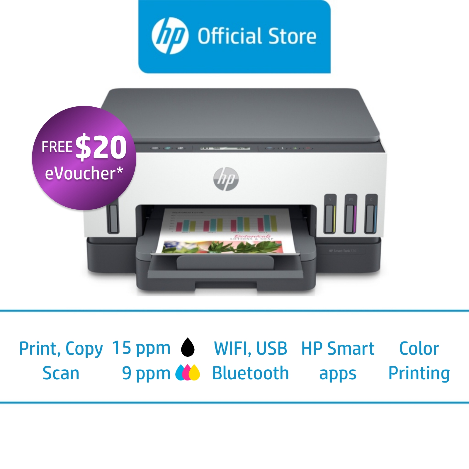 HP Smart Tank 720 Wireless All-in-One Color Inkjet Printer / Print, Copy, Scan / Two-Sided / Duplex / One Year Warranty