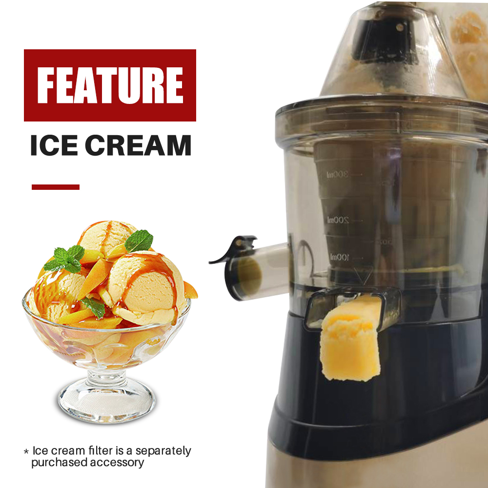Reminder: After-sales service does not include shipping!How to use the ice cream strainer.Step 1: Be sure to open the silicone plug at the bottom of the mixing cup.Step 2: Finish assembling the juicer.Step 3: Start the machine and slowly put in frozen fruits, vegetables, milk, etc. (Tip: Juicer cannot handle hard ice, etc.)