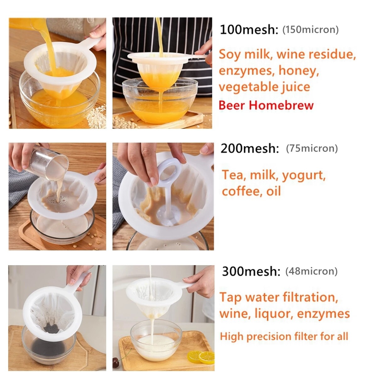 100 mesh: used to filter home-brewed beer, soybean milk, wine dregs, honey, vegetable juice.