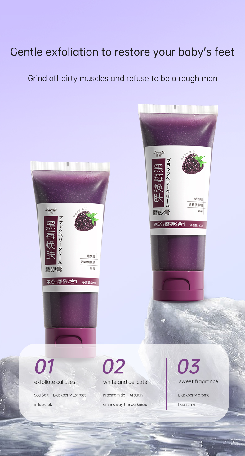 Product specification: 200mlProduct Name: Blackberry Peeling ScrubProduct ingredients: water, glycerin, beetroot, xylitol, acrylic acid, arbutin, butanediol, RUBUS VILOSUS, PKG-40, EDTA two dosesProduct efficacy: ―Contains blackberry extract, which cleans the skin while refreshing, nourishing and moisturizing, leaving the skin silky, moist and shiny after washing.How to use: Wet the area that needs to be scrubbed with warm water first, then take the size of your thumb and apply it evenly on the skin such as hands and feet, massage clockwise with moderate force for 2 to 3 minutes, until the dead skin is rubbed out, then rinse