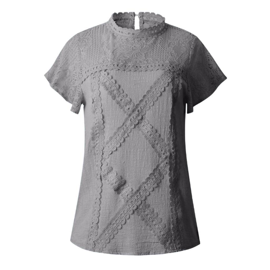 Womens Lace Patchwork Flare Ruffles Short Sleeve Cute Cotton Shirt Blouse Top
