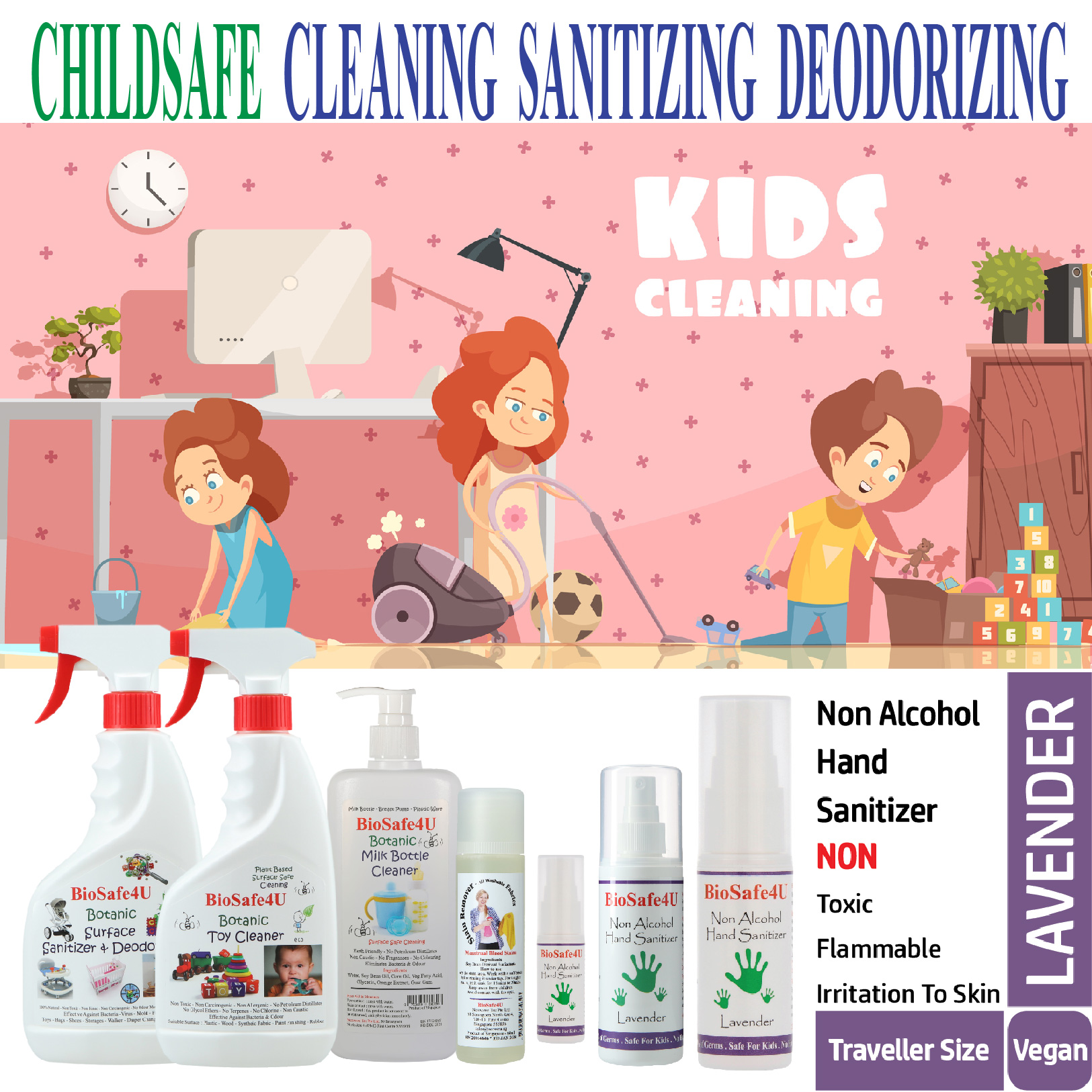 BioSafe4U Non Alcohol Hand Sanitizer anti-bacterial protection that eliminates 99.99% of germs.