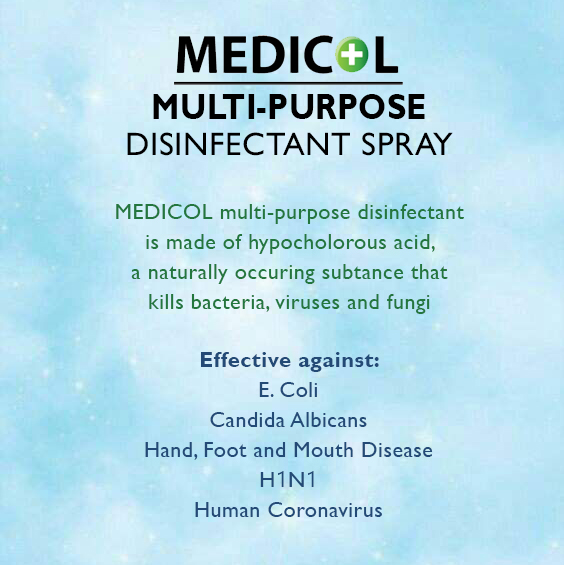 Formulated using hypochlorous acid, a naturally occurring substance, MEDICOL kills 99.99% of viruses, bacteria and germs, and it is Non-Flammable, Non-Drying to the skin, and Non-Corrosive. It is extremely safe, and effective at the same time!