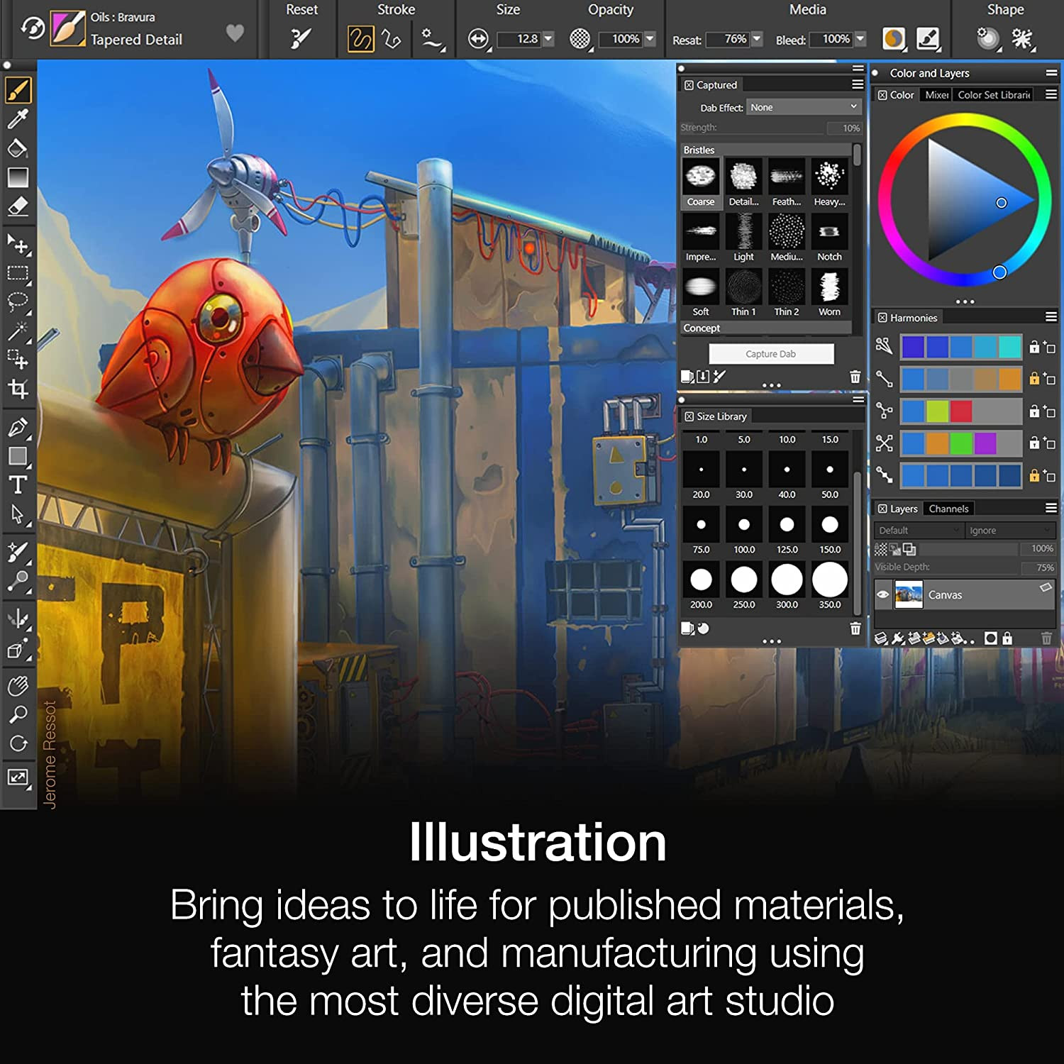 Hundreds of diverse brushes including traditional media like chalks, watercolors, acrylics, Thick Paint, and exclusive digital media such as Particles, Pattern Pens, and Images Hoses