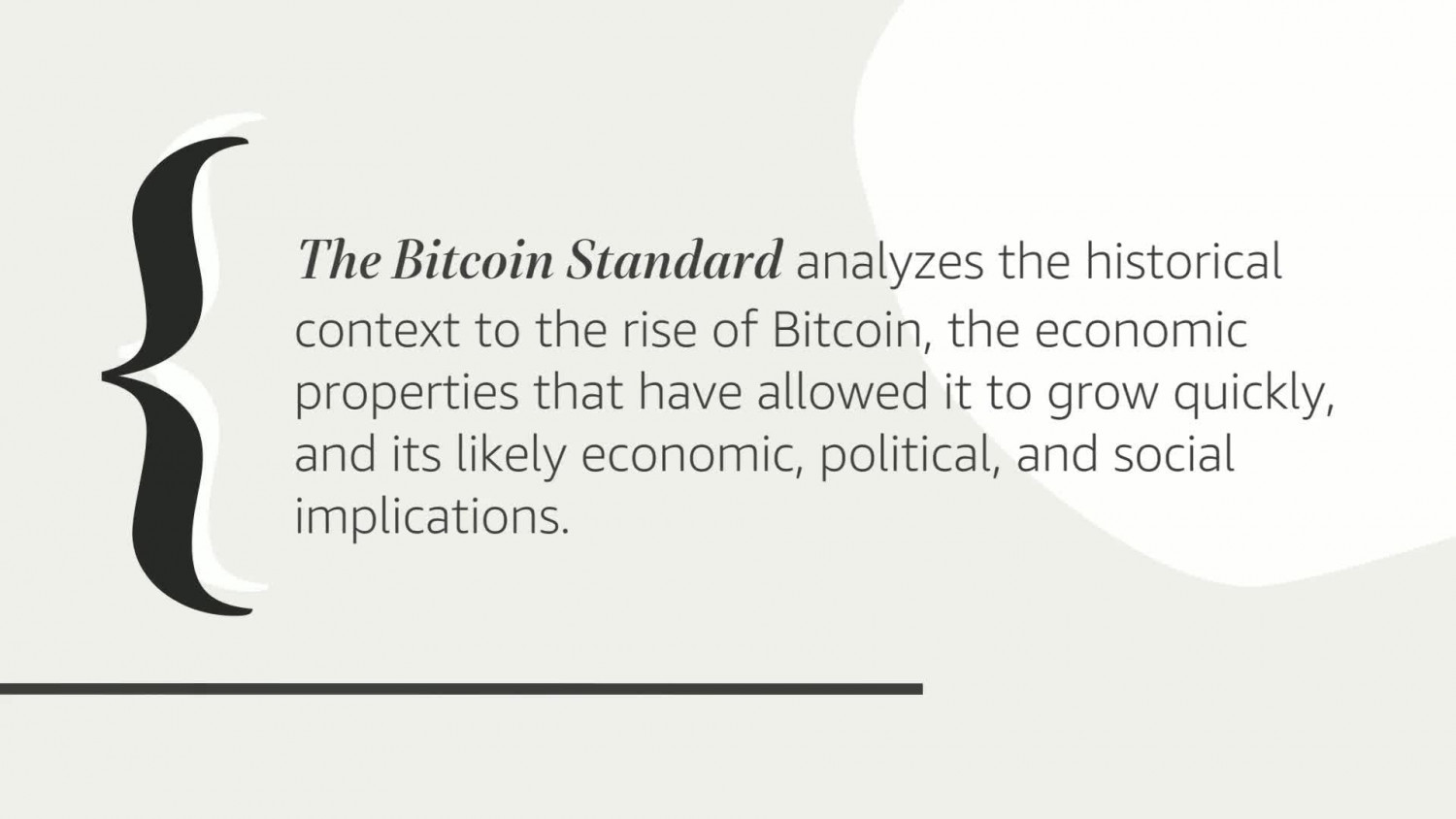 When a pseudonymous programmer introduced “a new electronic cash system that’s fully peer-to-peer, with no trusted third party” to a small online mailing list in 2008, very few paid attention. Ten years later, and against all odds, this upstart autonomous decentralized software offers an unstoppable and globally-accessible hard money alternative to modern central banks. The Bitcoin Standard analyzes the historical context to the rise of Bitcoin, the economic properties that have allowed it to grow quickly, and its likely economic, political, and social implications.